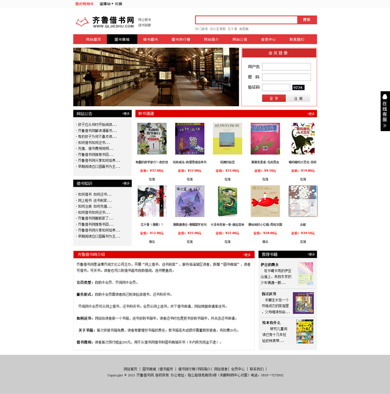 齊魯借書網(wǎng)是淄博齊閱文化公司主辦,開展“網(wǎng)上借書、送書到家”,服務(wù)臨淄城區(qū)讀者,新增“圖書商城”,讀者 可借書,可買書。讀者也可以到借書超市自助借閱,選書更直觀。